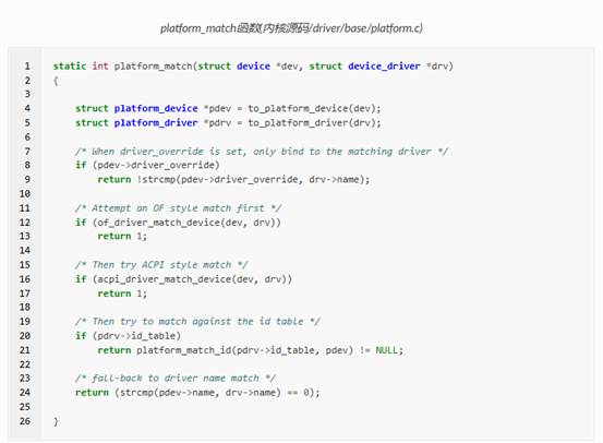 然后第一个if是驱动覆盖匹配,这是最高优先级的匹配方式,用于 “强制让设备绑定到指定驱动”。如果platform_device的driver_override字段被设置(比如用户手动指定了驱动名),则直接比较driver_override和驱动的.driver.name是否一致。