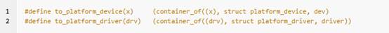 下面一些东西可能还没见到不要紧后面我会讲。我们可以看到这里调用了to_platform_device()和to_platform_driver()宏。实际上里面就是containerof函数,找到我需要的platform_device和platform_driver结构体。后面会讲,因为其实平台设备和平台驱动结构体的成员有最基础的设备和驱动对应的结构体,可以说是一种继承关系。