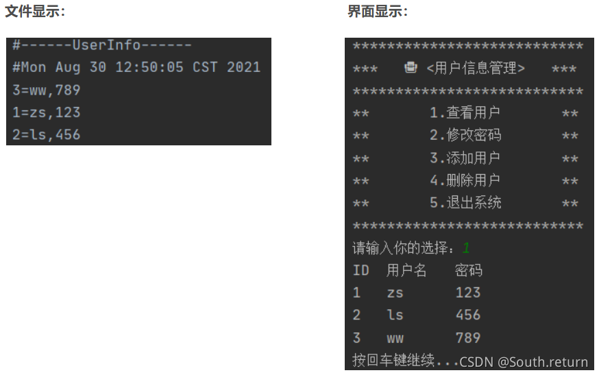 设计思路:定义全局变量文件路径和用户id,通过Properties集合实现与文件信息的交互,用户id作为键,用户名和密码作为值保存到集合然后存储到文件,用户名和密码通过","隔开,方便单独获取值,用split()方法分割字符串。(其他模块数据与文件交互的地方都是这样实现,只是键和值的设计不同)总体来说该部分设计还是比较简单,注意一下实现流程和操作判断就可以了。