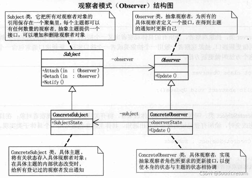 注意:具体目标对象和具体观察者对象之间不能直接调用,否则将使两者之间紧密耦合起来,这违反了面向对象的设计原则。