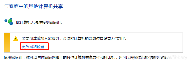 右下角“网络”图标上点击右键,选择“打开网络和共享中心”,选择左下角的“家庭组”,打开家庭组窗口,点击“更改网络位置”,如下图: