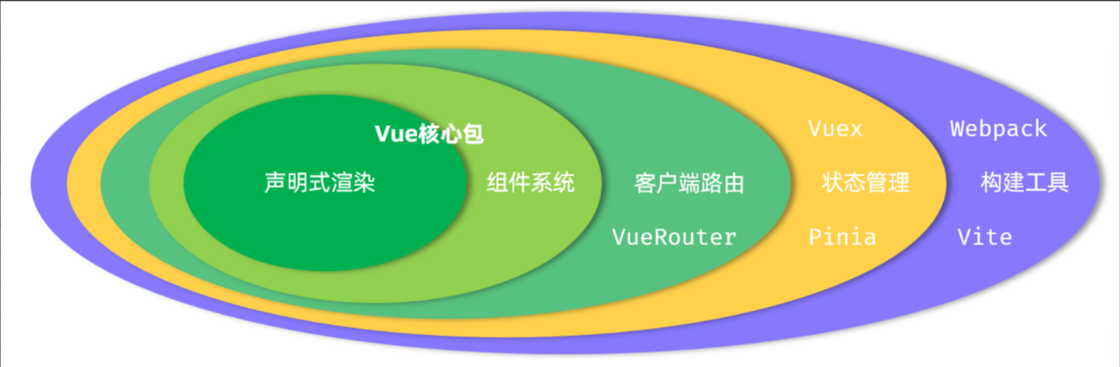 渐进式中的渐进呢,字面意思就是 "循序渐进"。Vue生态中的语法呢是非常多的,比如声明式渲染、组件系统、客户端路由(VueRouter)、状态管理(Vuex、Pinia)、构建工具(Webpack、Vite)等等。