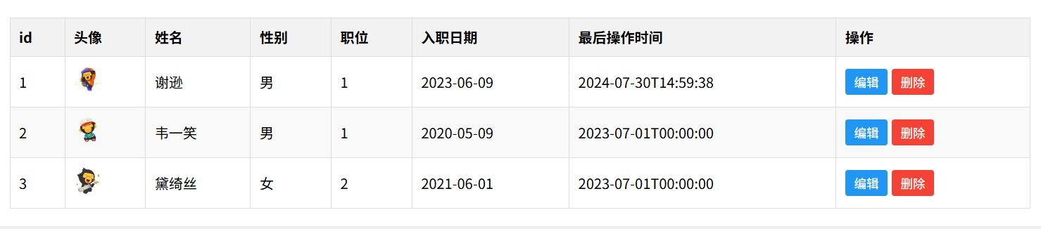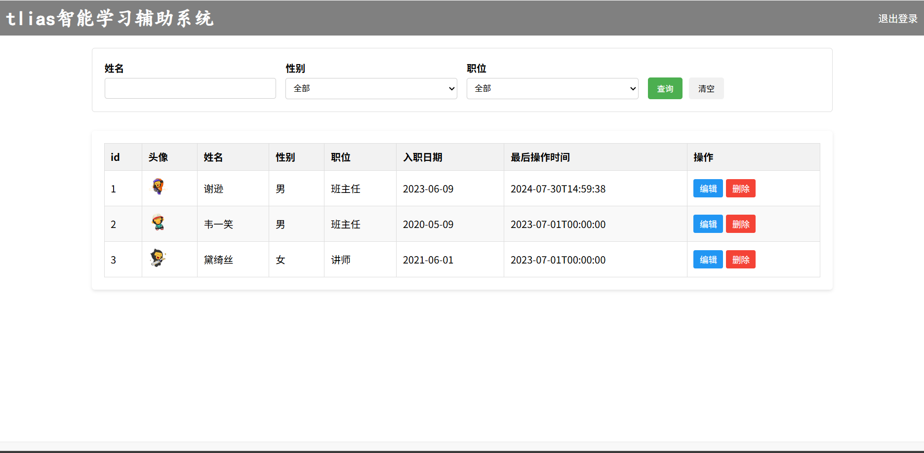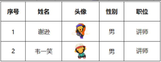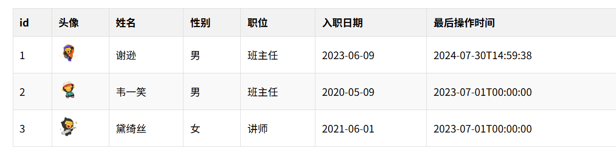 {"id": 1, "name": "谢逊", "image": "1.jpg", "gender": 1, "job": "班主任"},