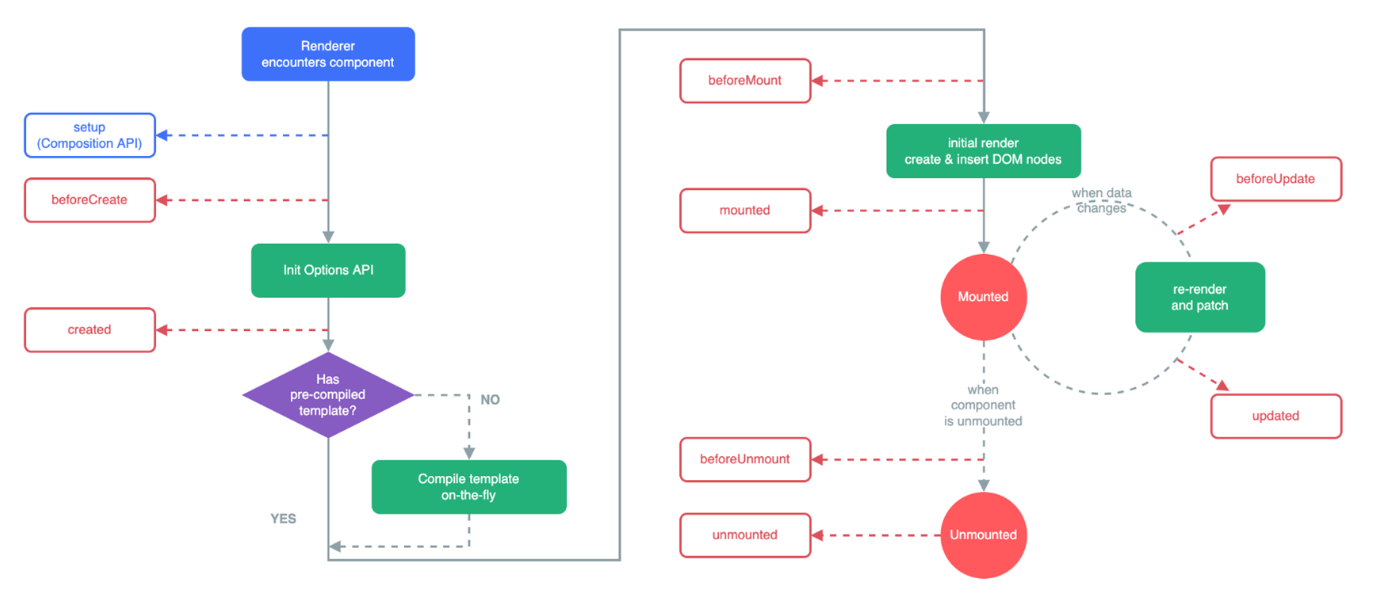 下图是 Vue 官网提供的从创建 Vue 到效果 Vue 对象的整个过程及各个阶段对应的钩子函数: