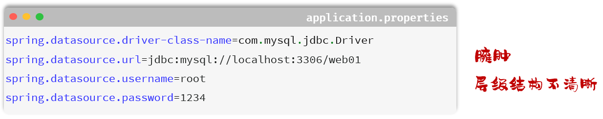 我们可以来对比一下,采用 application.properties 和 application.yml 来配置同一段信息(数据库连接信息),两者之间的配置对比: