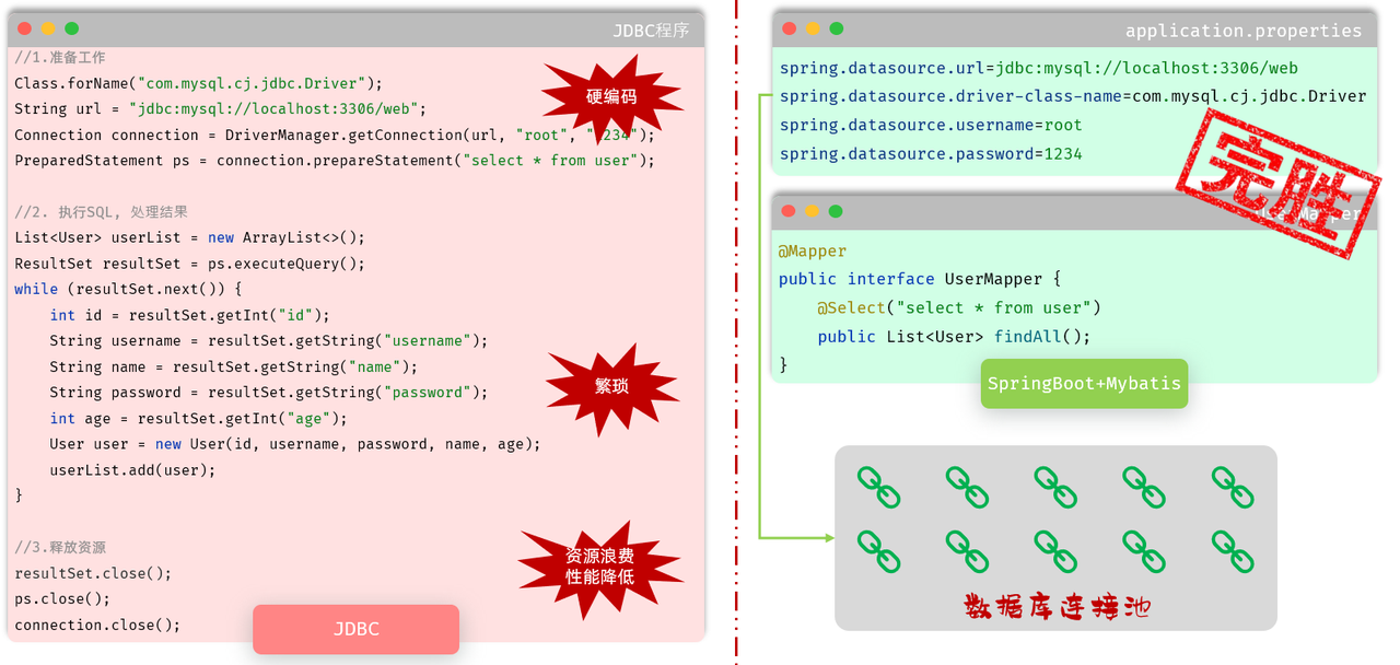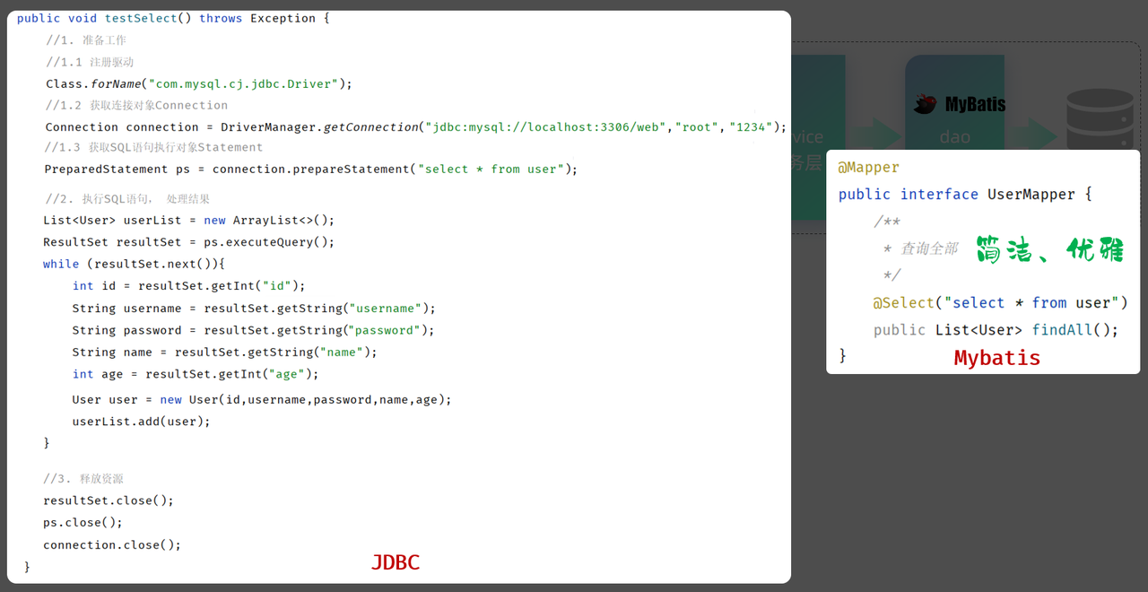 那有了JDBC之后,我们就可以直接在java代码中来操作数据库了,只需要编写这样一段java代码,就可以来操作数据库中的数据。 示例代码如下: