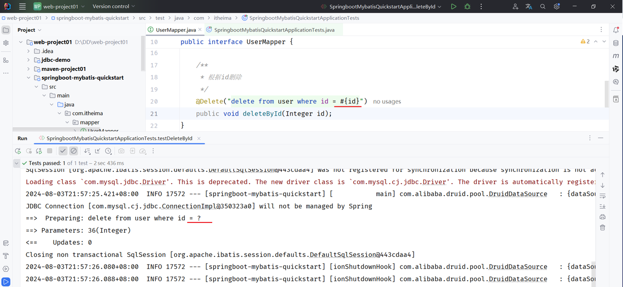 说明:基于官方骨架创建的springboot项目中,接口编译时会保留方法形参名,@Param注解可以省略 (#{形参名})。