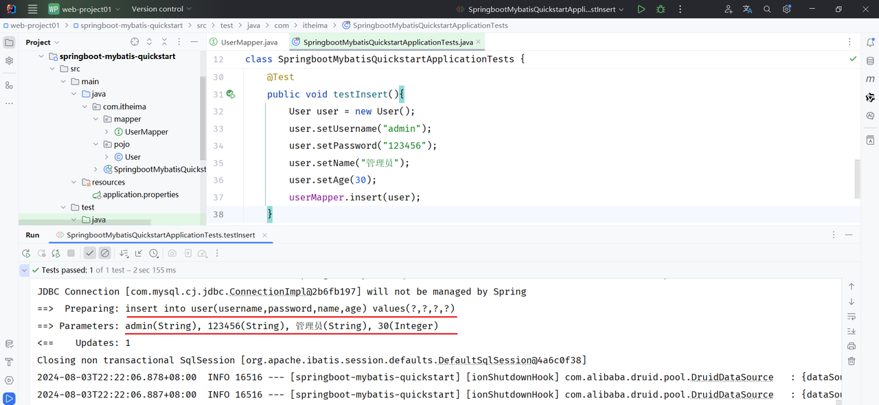 2). 在 src/main/test/java 目录下编写测试类,定义测试方法