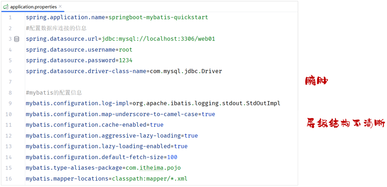 前面我们一直使用springboot项目创建完毕后自带的application.properties进行属性的配置,而如果在项目中,我们需要配置大量的属性,采用properties配置文件这种 key=value 的配置形式,就会显得配置文件的层级结构不清晰,也比较臃肿。