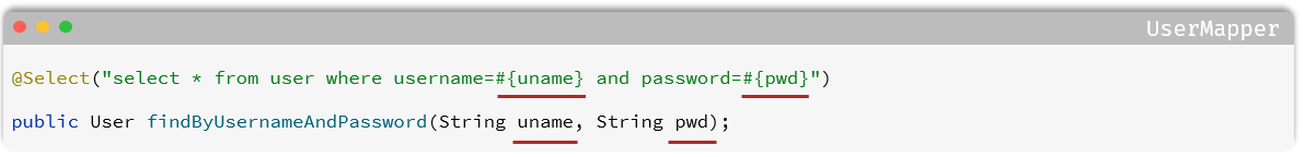 @Select("select * from user where username = #{username} and password = #{password}")