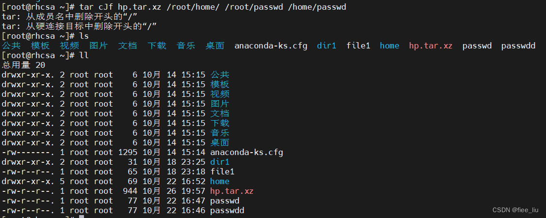 4、将/root/home目录,/home/passwd和/root/passwd打包并压缩为/root/hp.tar.xz (tar5-cJf)