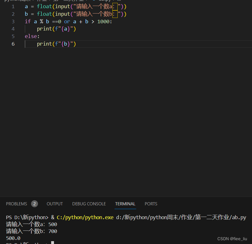 6.用户输入两个数a、b。如果a能被b整除或a加b大于1000,则输出a;否则输出b。
