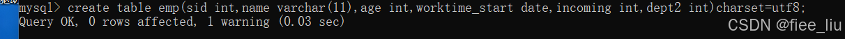 create table emp (sid int ,name varchar(11),age int,worktime_start date,incoming int,dept2 int) charset=utf8;