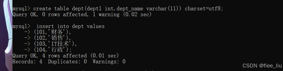 create table dept (dept1 int ,dept_name varchar(11)) charset=utf8;