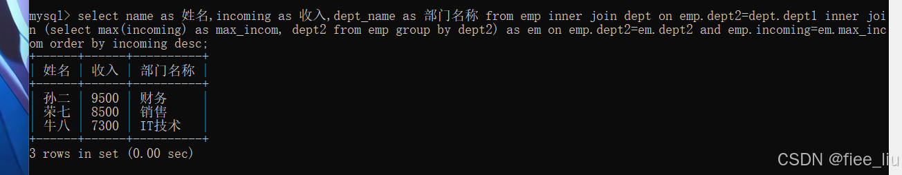 15.列出每个部门中收入最高的员工姓名,部门名称,收入,并按照收入降序