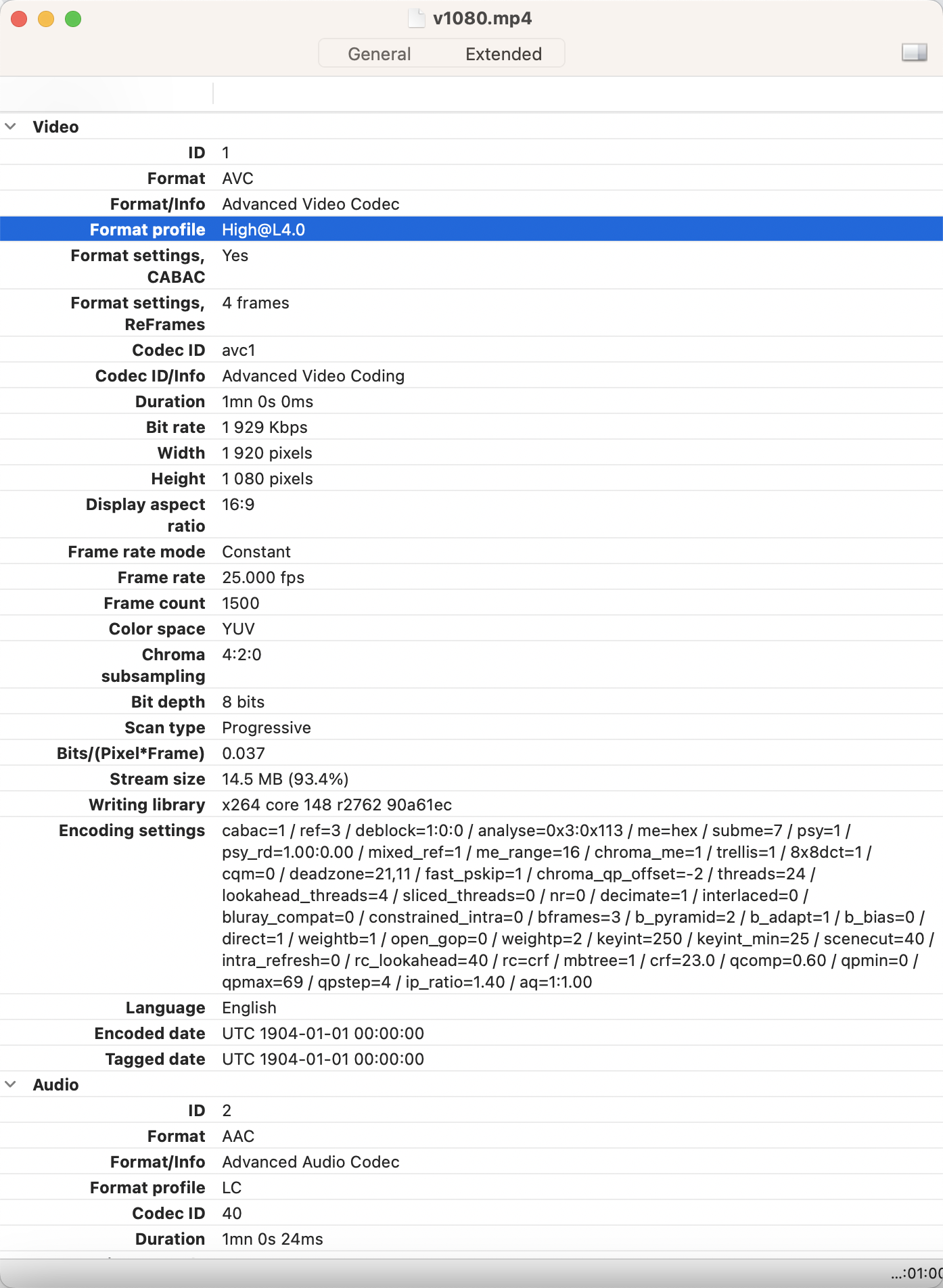 Bit rate | 比特率 | 1929Kbps | 指视频或音频文件在单位时间内使用的数据流量 |
