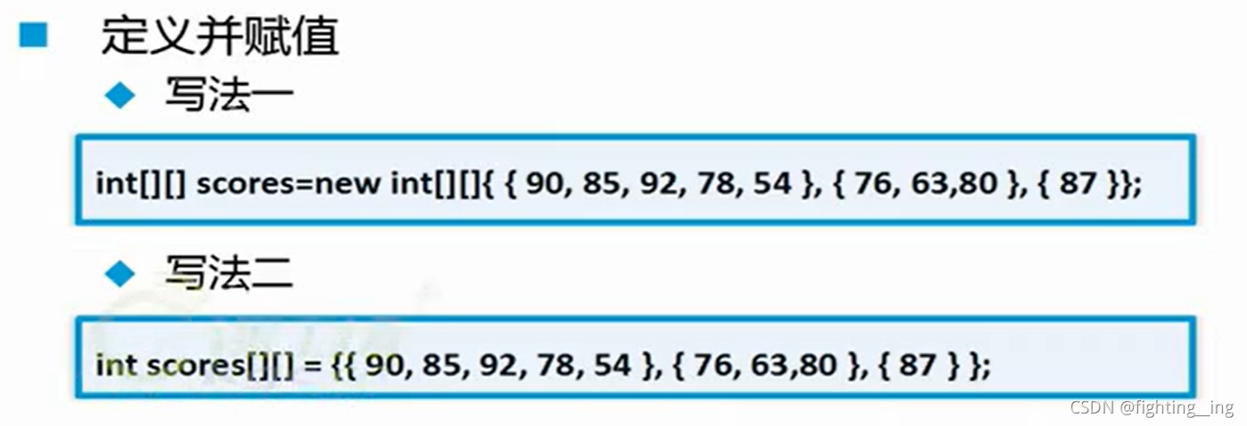 定义:数据类型[ ] [ ] 数组名; / 数据类型 数组名[ ] [ ] ;
