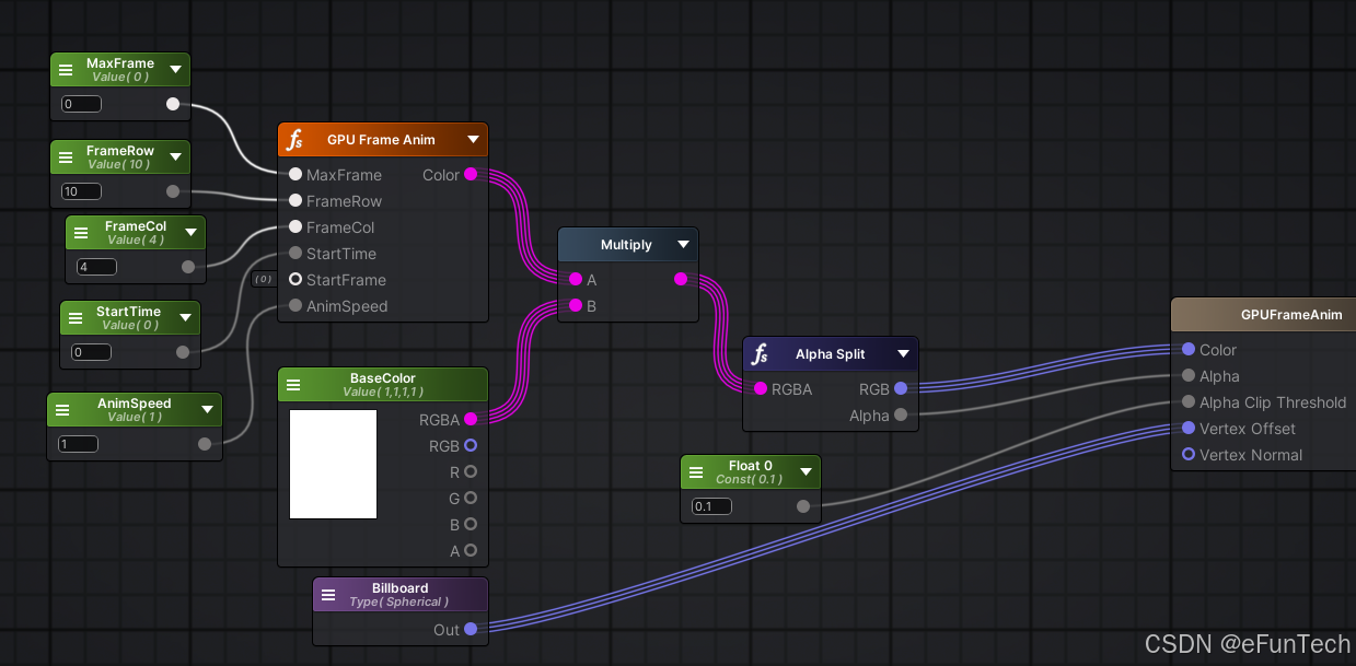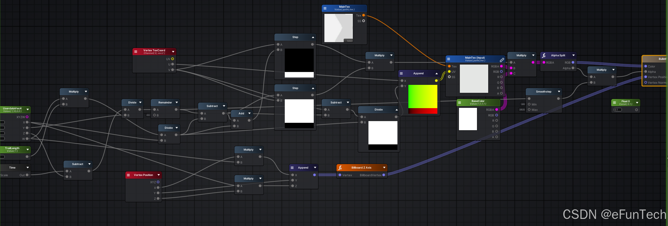 通过对顶点偏移确定子弹移动距离,通过UV偏移对子弹贴图采样绘制得到子弹移动效果,为避免不同视角下子弹面片穿帮,还需要实现绕Z轴旋转的Billboard。