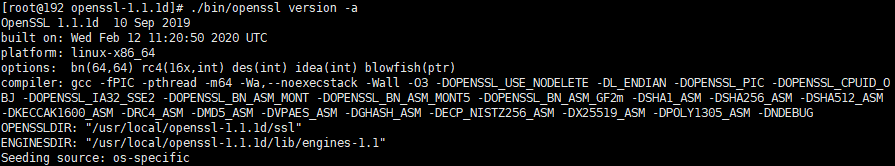 重新查看版本:(当前在openssl安装目录下,使用命令./bin/openssl version -a 查看版本以及调用的库文件)