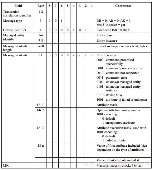 上图所示即为整个OMCI报文段,前两个字节为Transaction correlation identifier,第3个字节,49意思是OLT发送请求到ONU,类型是为GET,这点wireshark已经解析,具体字节含义和参考ITU-T988.x相关协议。