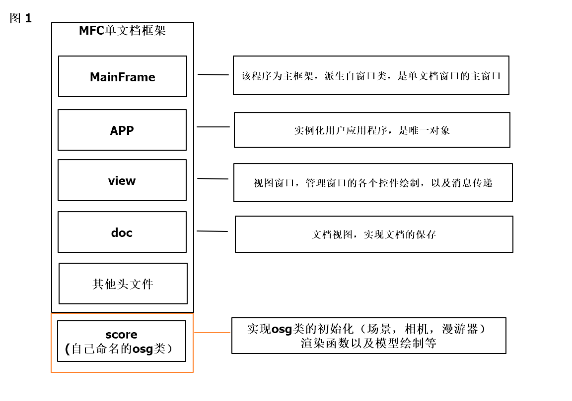 如图1,在创建好MFC单文档框架的前提下,新建一个.h文件并且在该.h文件中新建一个类,该类代表OSG类,在osg类中,我们要实现场景的初始化功能以及渲染功能。具体的表现形式如下。