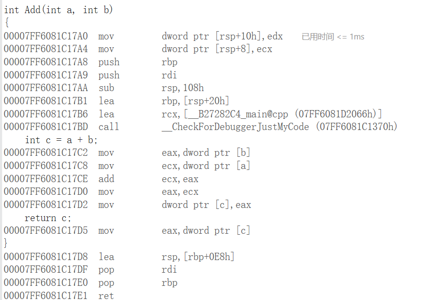 可以看到,与普通的函数不同,内联函数的确是在调用的地方展开。