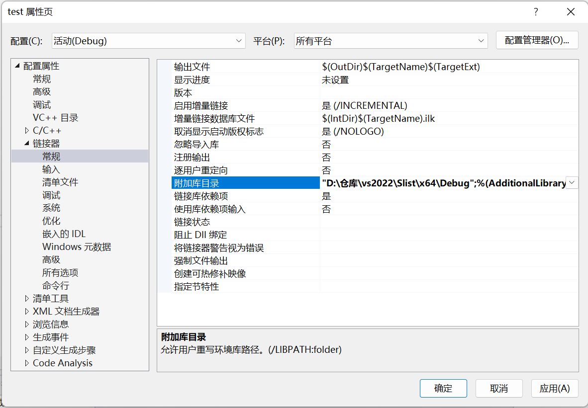 我们需要在上述位置将静态库中的Debug文件夹的路径添加上