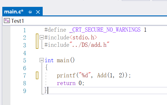 在使用C静态库中函数前,我们首先要包含头文件。与以往不同,我们需要通过文件的路径去寻找头文件(Add.h)