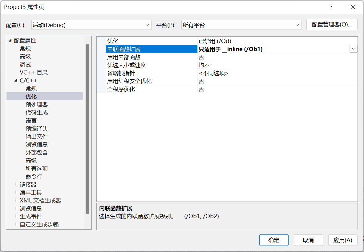 2. 在debug模式下,需要对编译器进行设置,否则不会展开,因为debug模式下,编译器默认不