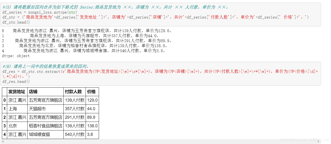 (5) 请将数据后四列合并为如下格式的 Series:商品发货地为 ××,店铺为 ××,共计 ×× 人付款,单价为 ××。