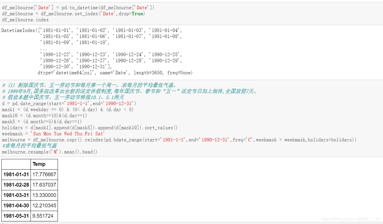 (1) 剔除国庆节、五一劳动节和每月第一个周一,求每月的平均最低气温。