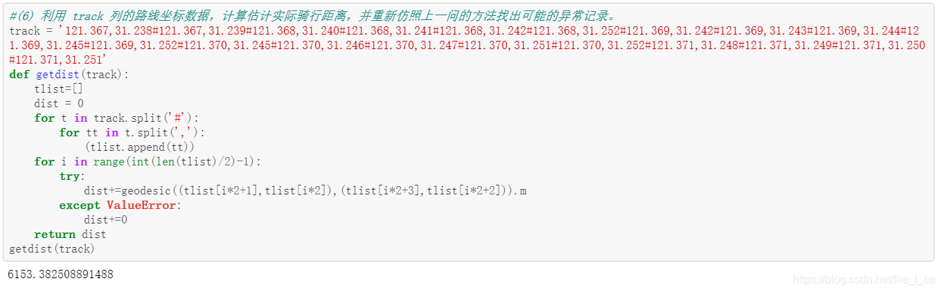 (6) 由于路线的曲折性,起点到终点的球面距离往往不能充分反应行程长 度,请利用 track 列的路线坐标数据,计算估计实际骑行距离,并重新 仿照上一问的方法找出可能的异常记录。