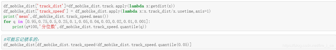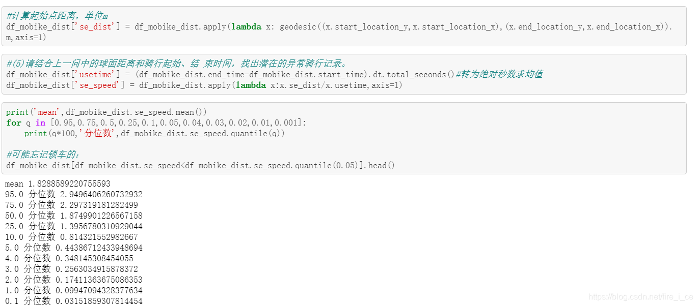 (5) 摩拜单车的骑行结束时间是以电子锁关闭的记录时间为准,但有时候用 户会忘记关锁,导致骑行时间出现异常。同时,正常人的骑行速度往往 大致落在一个合理的区间,请结合上一问中的球面距离和骑行起始、结 束时间,找出潜在的异常骑行记录。