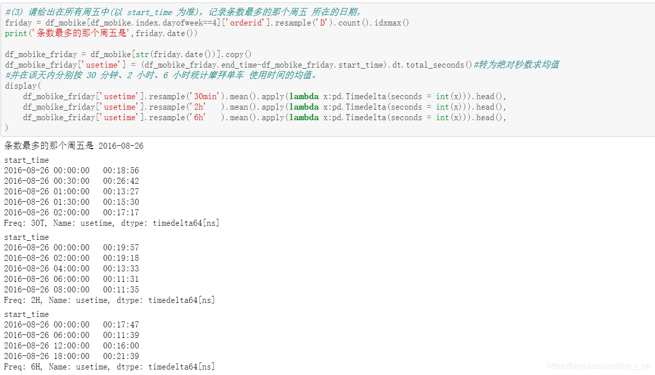(3) 请给出在所有周五中(以 start_time 为准),记录条数最多的那个周五 所在的日期,并在该天内分别按 30 分钟、2 小时、6 小时统计摩拜单车 使用时间的均值。
