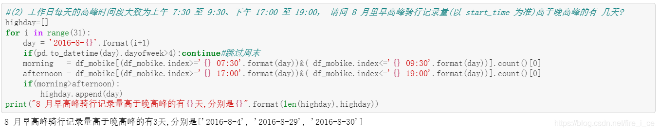 (2) 工作日每天的高峰时间段大致为上午 7:30 至 9:30、下午 17:00 至 19:00, 请问 8 月里早高峰骑行记录量(以 start_time 为准)高于晚高峰的有 几天?