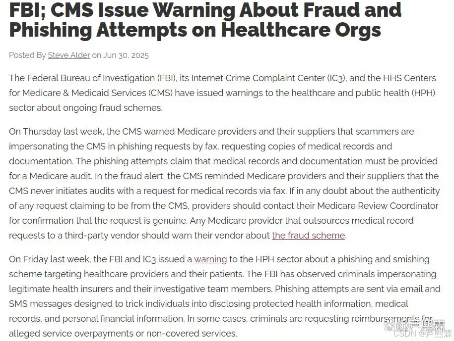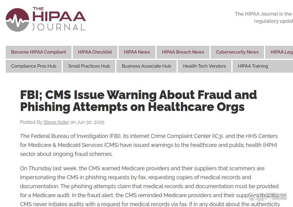 近年来,随着电子健康记录(Electronic Health Records, EHR)系统、远程诊疗平台及医保结算网络的广泛部署,美国医疗行业加速推进数字化转型。然而,这一进程也暴露出显著的安全脆弱性。2025年6月,美国联邦调查局(Federal Bureau of Investigation, FBI)与医疗保险和医疗补助服务中心(Centers for Medicare & Medicaid Services, CMS)联合发布紧急安全通告,指出针对医疗机构的钓鱼邮件与欺诈活动呈现爆发式增长。攻击者普遍伪造CMS官方通知、医保资格更新提醒或FBI合规审查函件,诱导医护人员点击嵌入恶意载荷的链接,进而窃取患者身份信息、医保凭证乃至部署勒索软件。