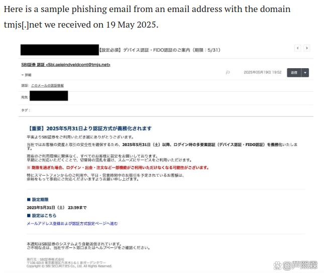 分析10封实际捕获的钓鱼邮件,其发件域名(如 tmjs.net、zxno.com)与页面跳转域名(如 sb-authline.cloud)往往不同,形成“邮件域—落地域”分离架构。这种设计可隔离风险:即使邮件域被封,落地页仍可继续运行。同时,邮件内容普遍包含紧迫性话术(如“账户异常需立即验证”),并嵌入短链接或掩码URL(如 https://****.sbs/infojp),规避邮件网关检测。