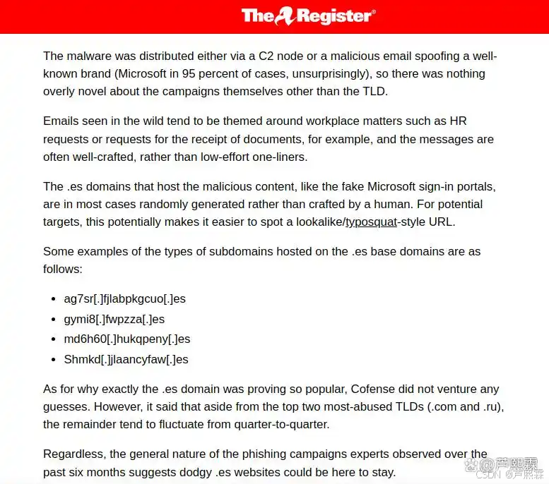 然而,2024–2025年间出现若干例外。除.es外,.it(意大利)、.fr(法国)等亦有零星滥用报告,但规模与集中度远不及.es。Cofense指出,.es滥用并非由单一攻击团伙主导,而是多个独立威胁行为体同步采纳的结果,暗示其背后存在某种“技术红利”或“策略共识”。