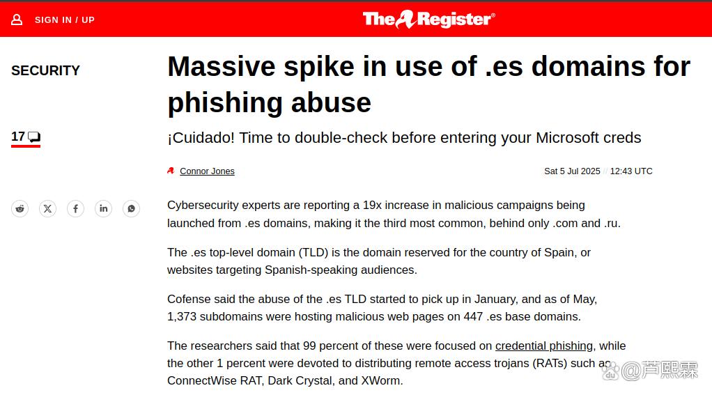 国家顶级域名(country code Top-Level Domain, ccTLD)如“.es”(西班牙)、“.de”(德国)或“.jp”(日本)传统上被视为具有较高可信度的网络标识,因其注册通常需满足地域归属或身份验证要求。相较之下,通用顶级域名(gTLD)如“.top”、“.xyz”因开放注册策略更易被滥用。然而,2025年初以来,安全社区观察到一个反常现象:原本滥用率较低的.es域名突然成为钓鱼攻击的主要载体之一。据Cofense等威胁情报机构披露,截至2025年5月,已有447个基础.es域名下衍生出1373个恶意子域名,其中99%用于凭证钓鱼,目标高度集中于Microsoft账户体系。