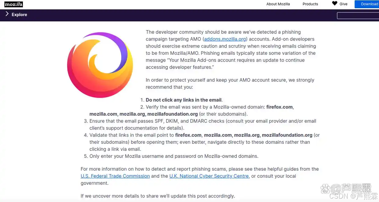 2025年8月1日,Mozilla在其官方博客发布公告,确认监测到针对AMO开发者的钓鱼活动。攻击邮件以“您的扩展因违反新安全策略被暂停”或“请立即完成账户二次验证”为由,引导收件人访问伪造的登录页面。页面外观与真实AMO完全一致,甚至包含有效的HTTPS证书与动态加载的Mozilla品牌资源。尽管Mozilla表示尚未发现大规模账户失陷,但此类攻击一旦得逞,将导致恶意代码通过合法渠道分发,形成典型的软件供应链攻击。