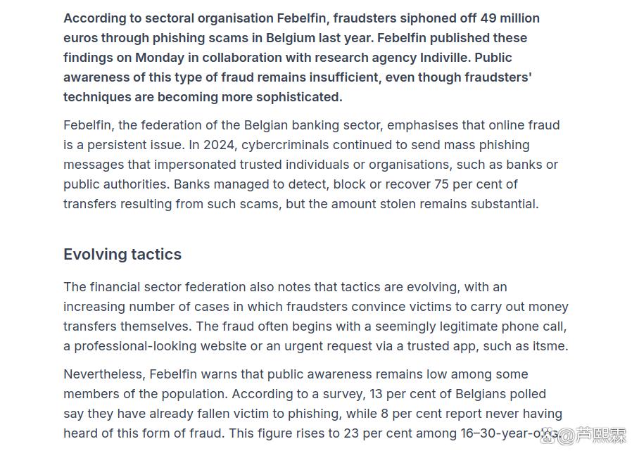 网络钓鱼(Phishing)作为最古老且持续演化的网络犯罪形式之一,其核心目标始终是诱骗受害者自愿交出敏感信息或执行资金转移操作。尽管安全技术不断进步,但根据比利时银行联合会(Febelfin)2025年8月发布的报告,2024年该国因钓鱼诈骗导致的资金损失达4900万欧元,较2023年上升约18%。值得注意的是,其中75%的欺诈性转账被银行成功拦截或追回,意味着若无现有风控措施,实际损失可能接近2亿欧元。这一数据揭示了一个关键矛盾:技术防御能力虽在提升,但攻击成功率仍在增长。