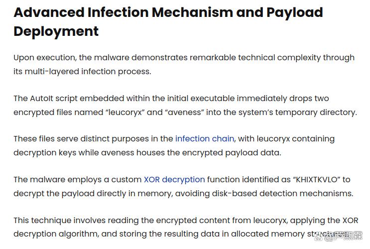 脚本调用自定义函数KHIXTKVLO,读取leucoryx中的密钥,对aveness内容进行逐字节XOR解密。解密后的数据为Shellcode,不写入磁盘,而是直接分配内存并执行。