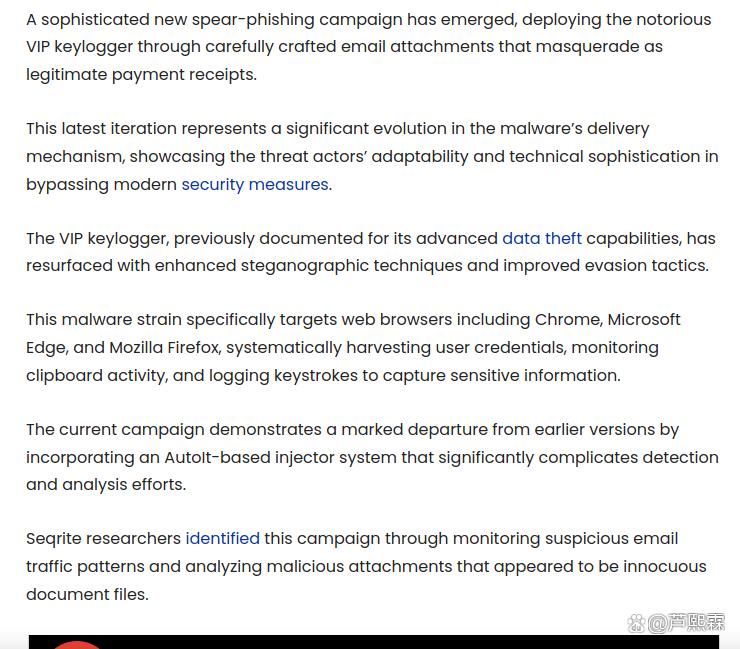 VIP键盘记录器的最新变种展示了鱼叉式钓鱼攻击在技术隐蔽性与目标精准性上的双重进化。本文通过逆向其多阶段注入机制,揭示了从社会工程诱骗到内存驻留窃密的完整链条。研究表明,单一防御手段难以应对此类高级威胁,必须构建覆盖预防、检测与响应的闭环体系。所提供的YARA规则与PowerShell脚本已在模拟环境中验证有效性,可为企业安全团队提供实用工具。面对持续演化的定向攻击,安全防御的核心在于理解攻击者的技术选择逻辑,并据此部署具有针对性的对抗措施,而非依赖泛化的安全产品堆砌。