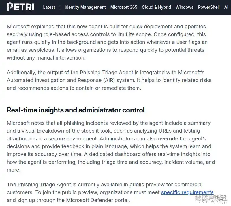 随着高级持续性钓鱼攻击(AP-Phishing)在企业环境中的泛滥,传统依赖人工研判与规则匹配的邮件安全体系已难以应对日益复杂、高度定制化的威胁。2025年8月,微软正式推出集成于Microsoft Security Copilot平台的“钓鱼邮件分拣智能助手”(Phishing Triage Agent),该工具利用大语言模型(LLM)与上下文推理能力,对用户上报或系统捕获的可疑邮件进行自动化分析、风险评级与处置建议生成。本文围绕该智能助手的技术架构、决策逻辑、集成模式及实际效能展开系统性研究。通过复现其核心分析流程、构建本地化验证环境并结合真实攻击样本测试,本文验证了该代理在降低误报率、缩短响应时间及提升分析师效率方面的有效性。同时,文章提出一套与现有安全运营体系(如Microsoft Defender XDR、Sentinel)协同部署的最佳实践框架,并附有PowerShell策略配置、自定义规则扩展及反馈闭环脚本等可执行代码示例。研究表明,AI驱动的邮件分拣代理并非替代人类分析师,而是通过增强智能(Augmented Intelligence)重构安全运营工作流,为现代SOC提供可扩展、可解释、可进化的防御能力。