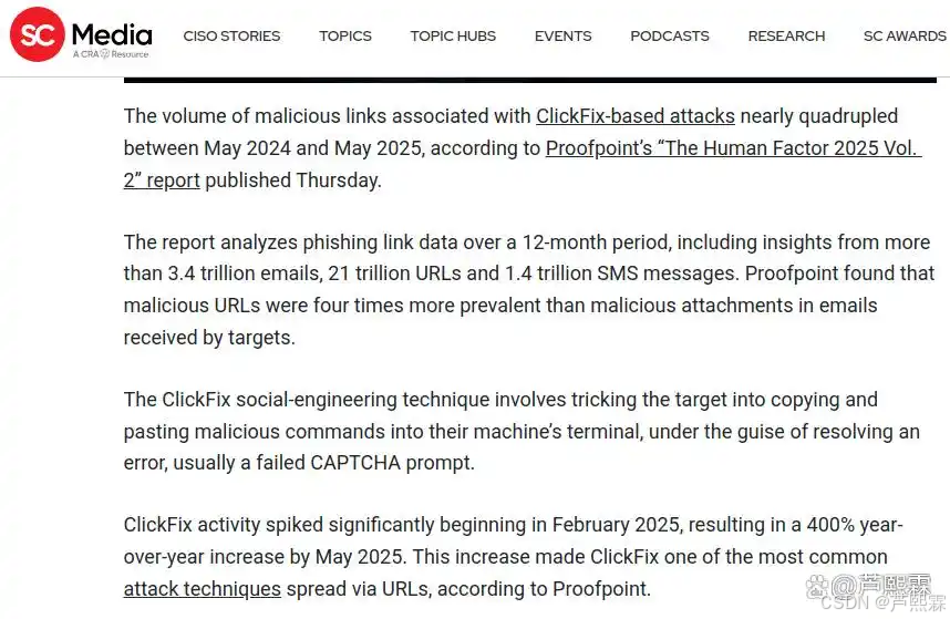 2025年中期发布的多项行业报告显示,ClickFix攻击在2024至2025年间呈现指数级增长。Proofpoint基于3.4万亿封邮件、21万亿条URL及1.4万亿条短信的分析指出,恶意链接数量已达恶意附件的四倍,而ClickFix正是其中增长最快的子类之一。更值得警惕的是,攻击者已将此类手法扩展至SMS(smishing)、协作平台(如Microsoft Teams)乃至二维码(quishing)等非传统邮件通道,形成跨媒介的攻击矩阵。