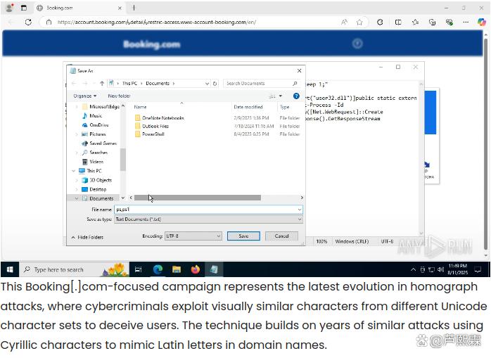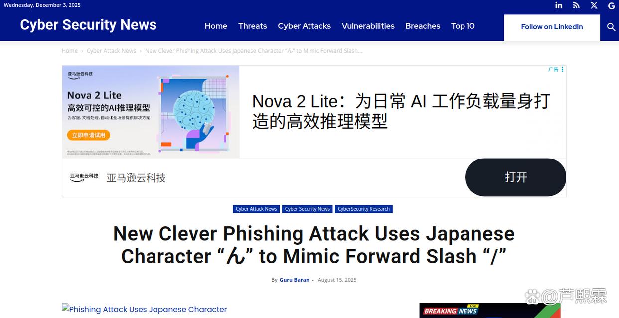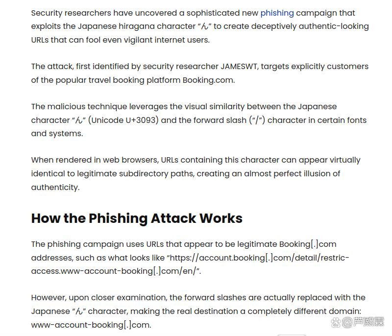 2025年8月,安全研究员JAMESWT首次披露了一起针对Booking.com用户的钓鱼活动,攻击者使用日文平假名“ん”(U+3093)替代URL路径中的正斜杠“/”,使https://account.booking[.]com/detail/restric-access.www-account-booking[.]com/en/在视觉上呈现为合法子路径,实则指向完全不同的恶意域名。更值得注意的是,此类攻击已从路径混淆扩展至完整域名构造,例如使用“ネ”(片假名Ne)冒充“N”、“ロ”(片假名Ro)冒充“L”或“O”,构建如examp1e.com与example.com(其中“l”为全角拉丁小写L)或paypa1.com与paypaネ.com等高混淆度变体。