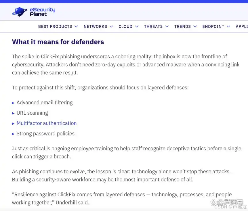 针对“ClickFix”的多维特性,单一防御措施效果有限。需构建以下协同防御体系: