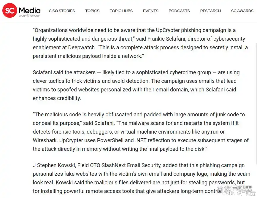 本文详细剖析了以“释放UpCryptor”为诱饵的全球钓鱼攻击,揭示了其利用多云分片投递、内存反射加载与环境感知激活的技术细节。研究表明,攻击者正系统性地规避基于静态特征的传统检测机制,迫使防御方转向行为分析与上下文感知。