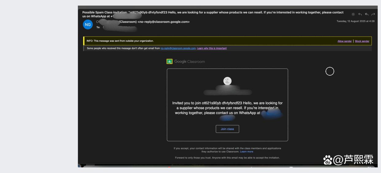 2025年8月,Check Point Research披露了一起针对Google Classroom的大规模钓鱼活动。攻击者在一周内发起五轮攻击波次,利用平台自动发送的课程邀请邮件作为载体,将商业欺诈内容(如SEO服务、产品代理等)伪装成教育通知,诱导收件人通过WhatsApp联系诈骗者。值得注意的是,此类邮件完全由Google服务器生成,具备完整的SPF、DKIM与DMARC认证记录,使得传统基于发件人信誉或黑名单的邮件过滤机制失效。