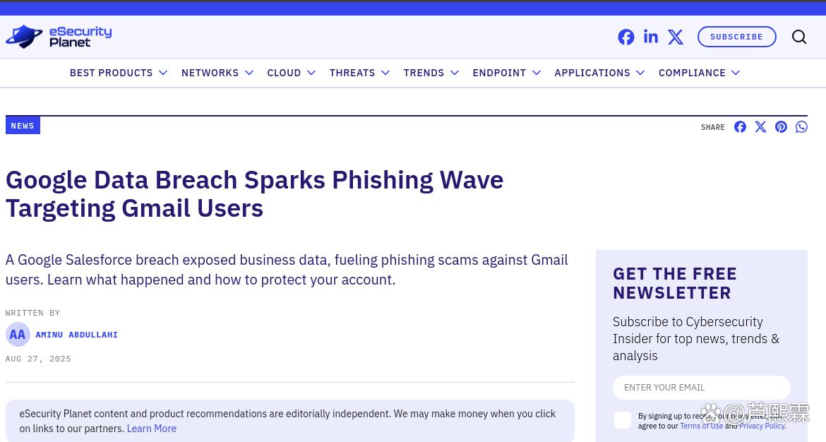 2024年末至2025年初,多家网络安全媒体集中报道了所谓“谷歌大规模数据泄露”事件,引发公众广泛关注。然而深入分析表明,该事件并非源于Google生产环境的直接入侵,而是攻击者将多年积累的第三方平台外泄凭证(如LinkedIn、Adobe、Canva等历史泄露数据库)与公开可爬取的用户邮箱信息进行交叉匹配后,重新包装为“谷歌泄露数据”进行营销的结果。这种“数据聚合翻炒”(Data Aggregation Repackaging)策略虽无新漏洞利用,却因精准指向主流邮箱服务而迅速转化为实际攻击行动。